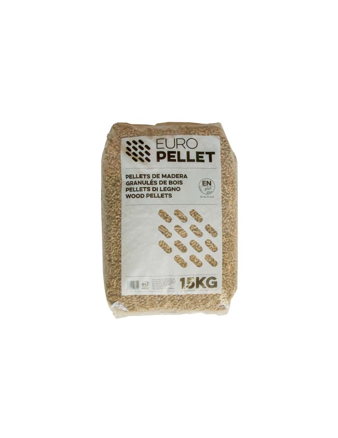 Palet de 38 sacos de pellet de madera de 15 kg bicoumbustible sólido formado por la compactación de materia prima forestal. El pellet se convierte en energía termica a través de distintas instalaciones, desde una estufa hasta una caldera.